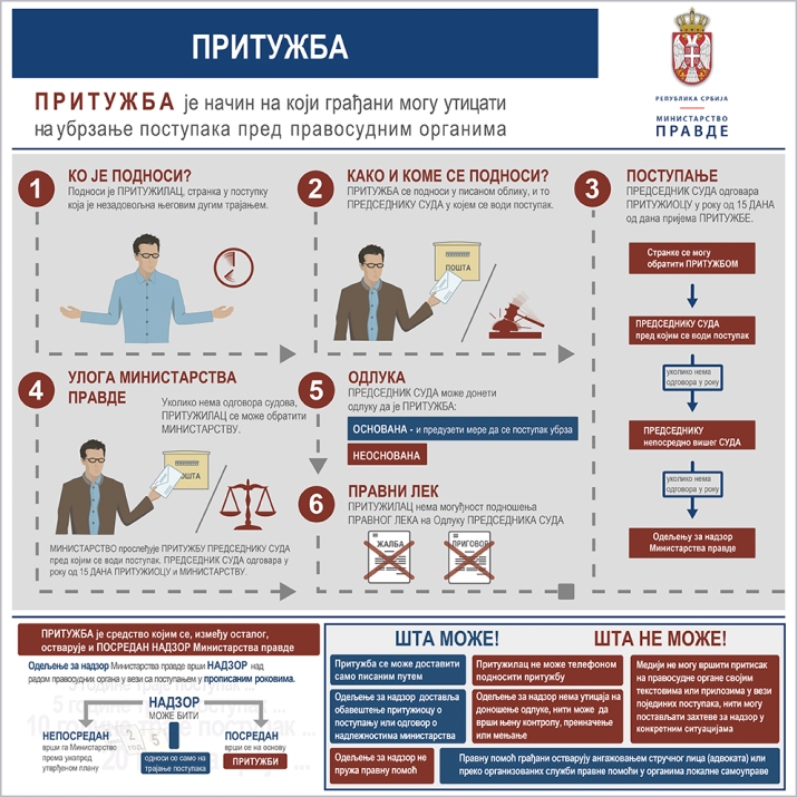 Странка или други учесник у судском поступку има право притужбе на рад суда, председнику суда, када сматрају да се поступак одуговлачи, да је неправилан или да постоји било какав утицај на његов ток и исход.